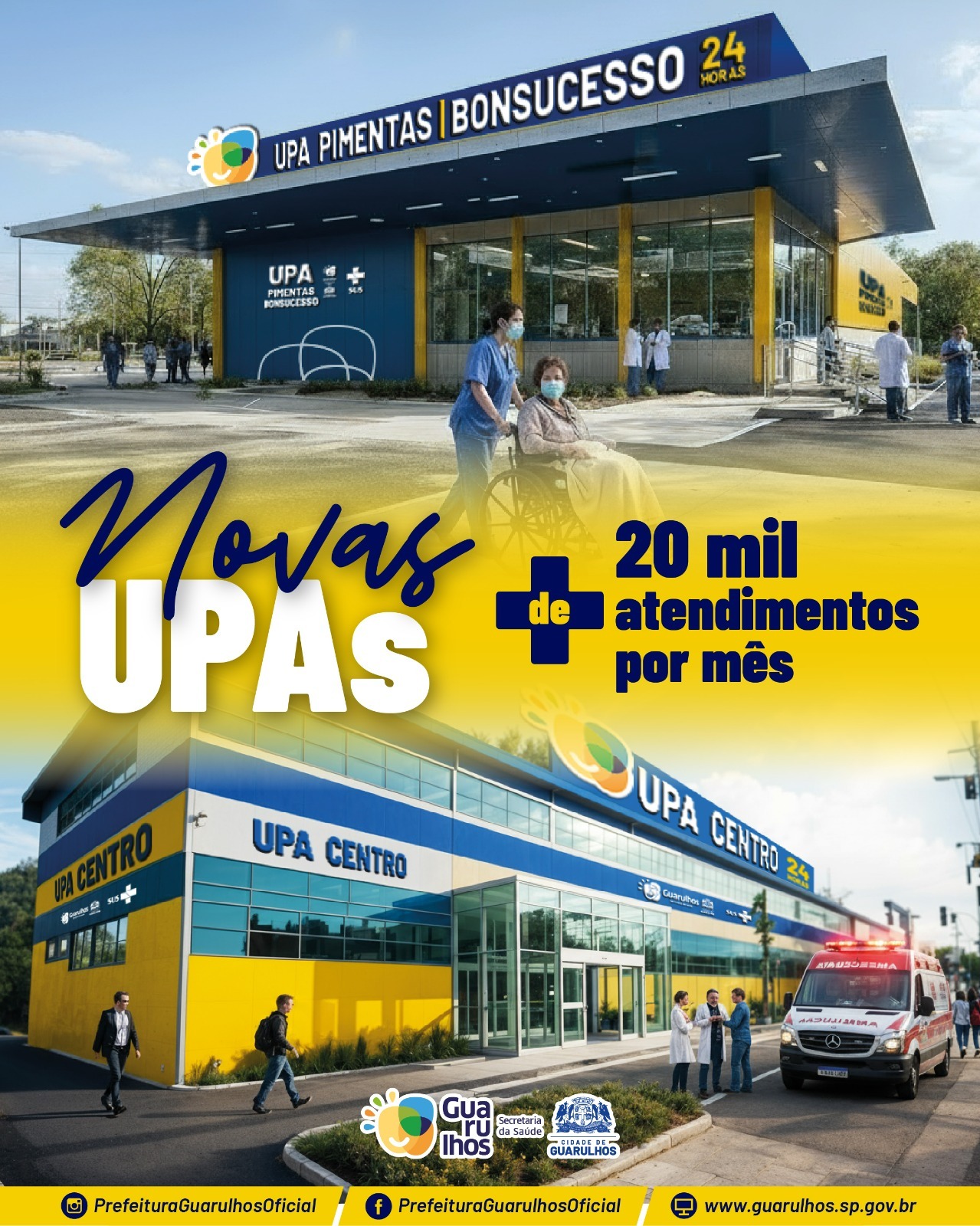 As duas novas UPAs (Unidades de Pronto Atendimento) anunciadas pela Prefeitura de Guarulhos terão capacidade para realizar até 20 mil atendimentos mensais, melhorando o fluxo de pacientes dos dois principais hospitais da cidade: HMPB (Hospital Municipal Pimentas Bonsucesso) e HMU (Hospital Municipal de Urgências).