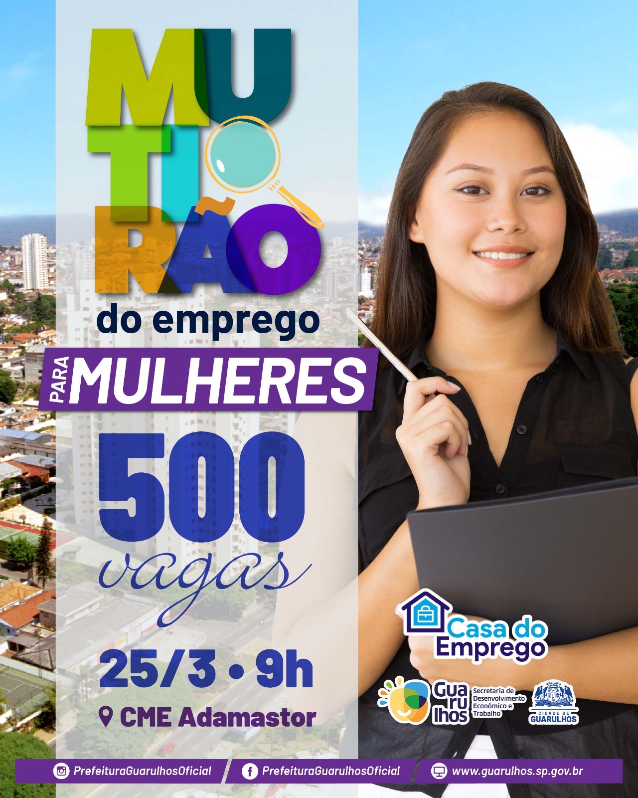 No mês da Mulher, a Prefeitura de Guarulhos, por meio da Secretaria de Desenvolvimento Econômico e Trabalho (SDET), realiza nesta quarta-feira, dia 25, das 9h às 16h, um mutirão de empregos e serviços para mulheres, no Centro de Educação do Adamastor (avenida Monteiro Lobato, 374, Macedo).