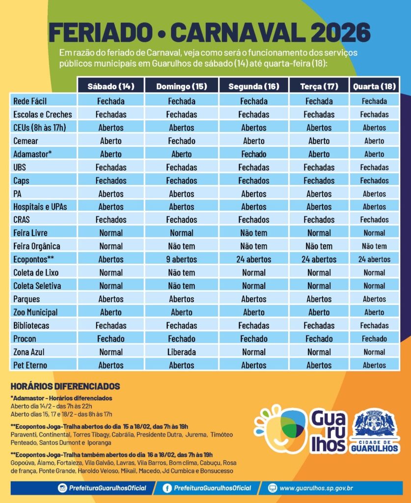 A Prefeitura de Guarulhos divulgou nesta quarta-feira (11) como será o funcionamento dos serviços públicos municipais durante o Carnaval, de sábado (14) a quarta-feira (18), em serviços como a Rede Fácil, escolas e creches. CEUs, parques municipais e o Zoológico da Prefeitura estarão abertos ao público, assim como algumas unidades dos Ecopontos Joga-Tralha.